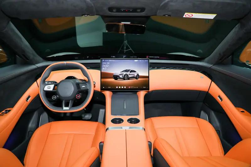 内饰方面,新车延续了家族式设计语言,提供松石灰、珊瑚橙、暮影蓝、鸢尾紫四种内饰颜色供选择。中控台部分,新车继续采用了家族式方向盘,拥有100%软包覆,并在仪表台上方配有1/4螺母,方便用户进行个性化拓展。中控屏幕采用16.1寸3K中控大屏,此外新车拥有两个后排拓展屏。
